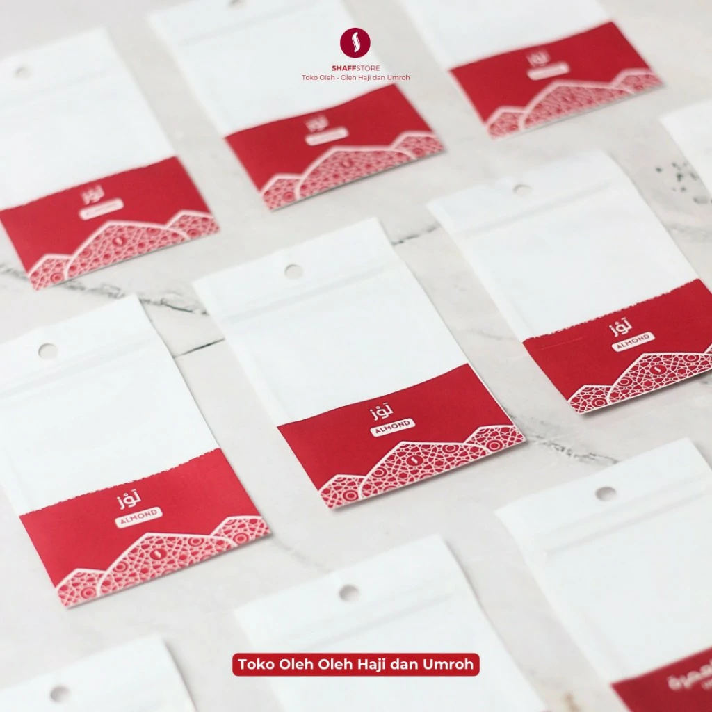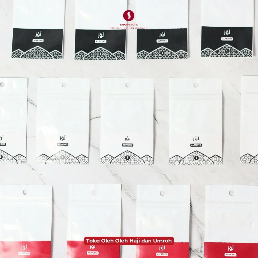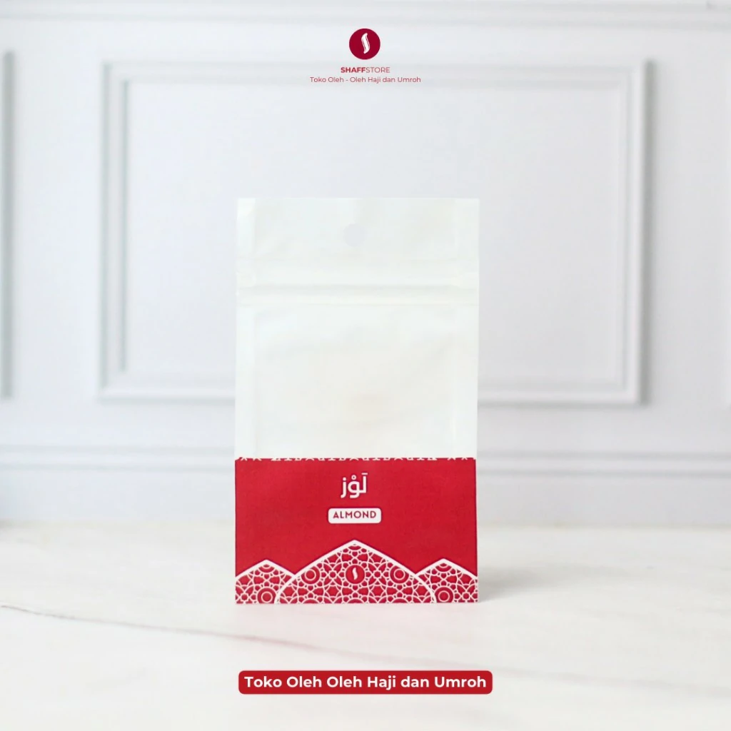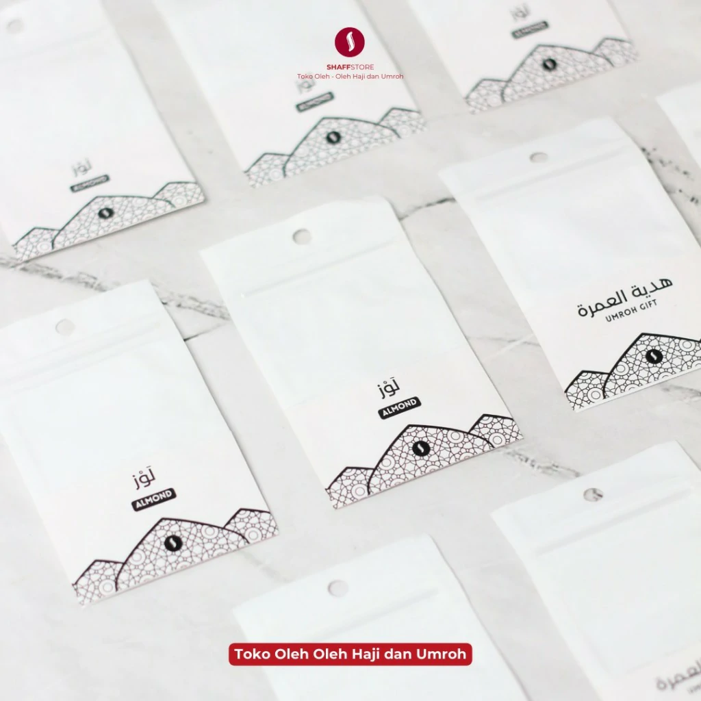 Kemasan plastik ziplock yang praktis dan aman untuk menyimpan berbagai jenis makanan kering atau souvenir umroh. Tersedia dengan stiker tulisan “Almond” yang elegan dan bermakna.