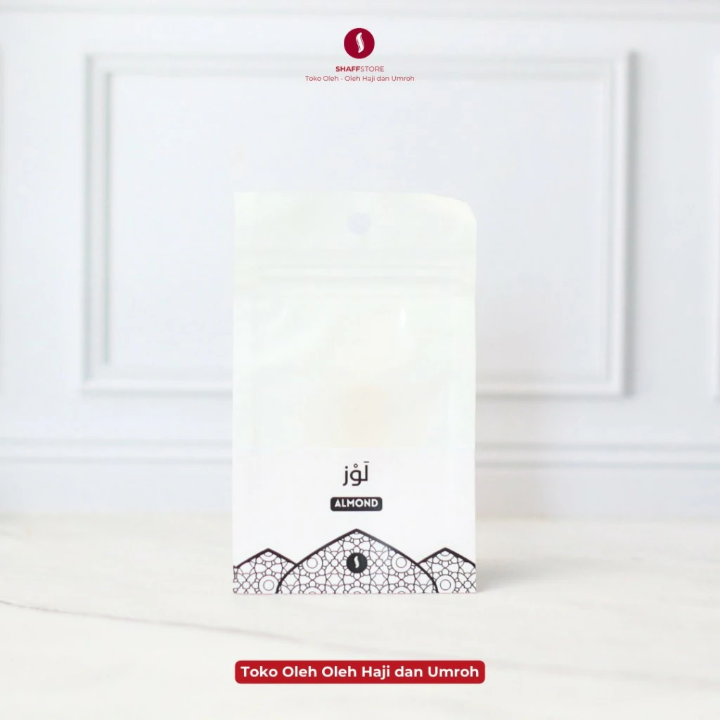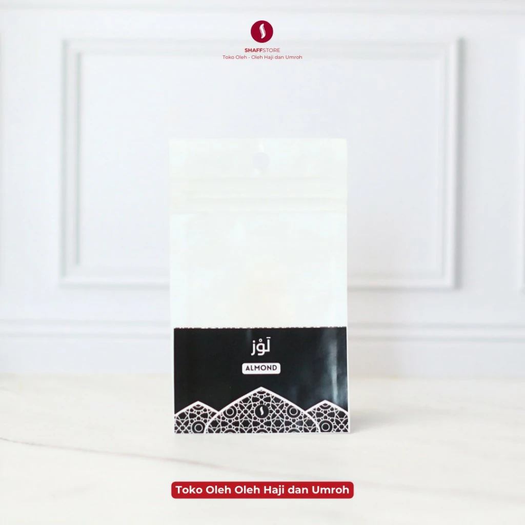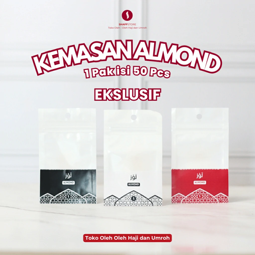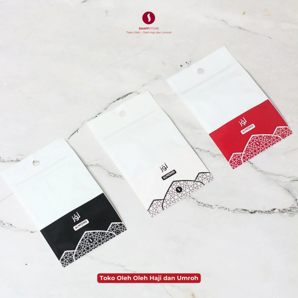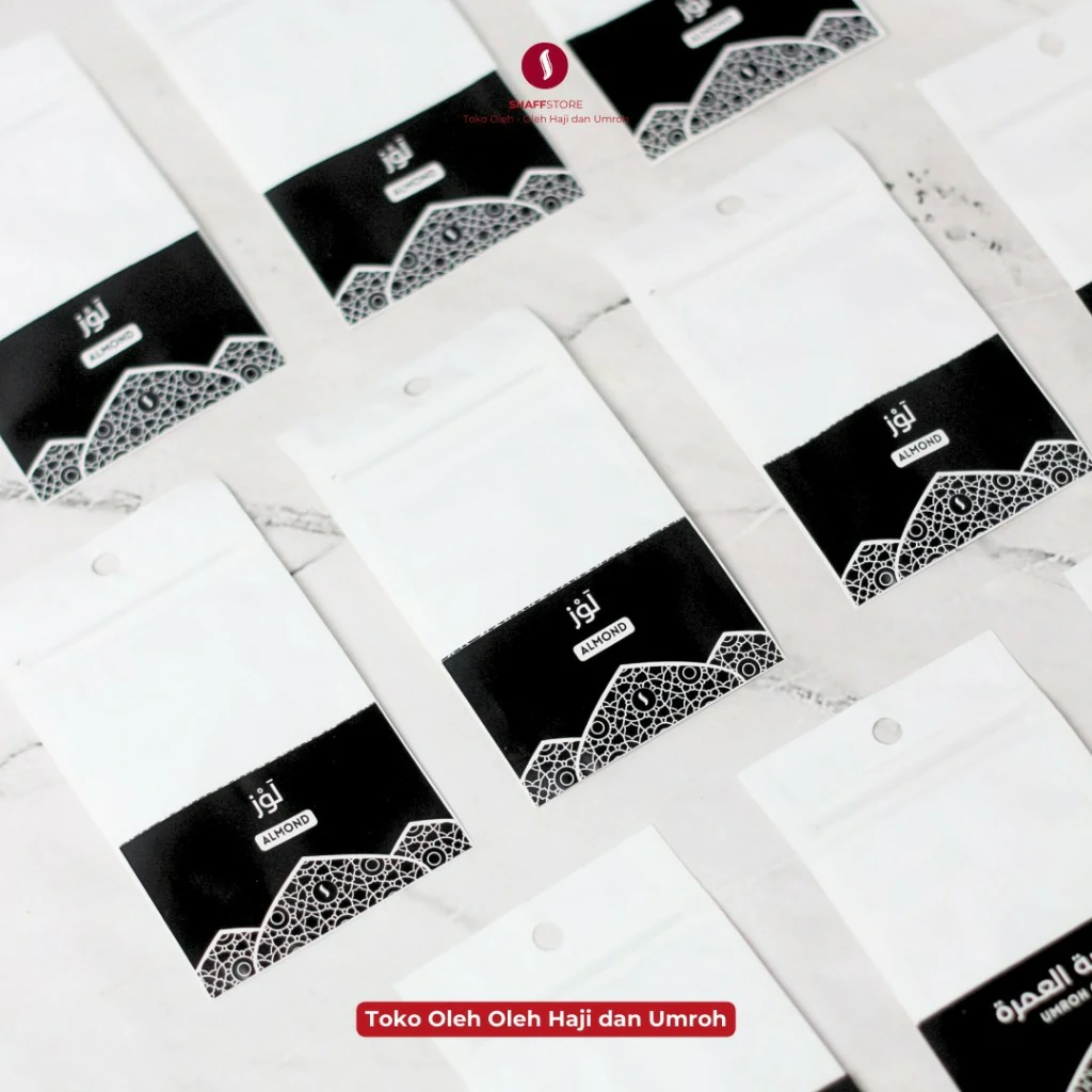 Kemasan plastik ziplock yang praktis dan aman untuk menyimpan berbagai jenis makanan kering atau souvenir umroh. Tersedia dengan stiker tulisan “Almond” yang elegan dan bermakna.