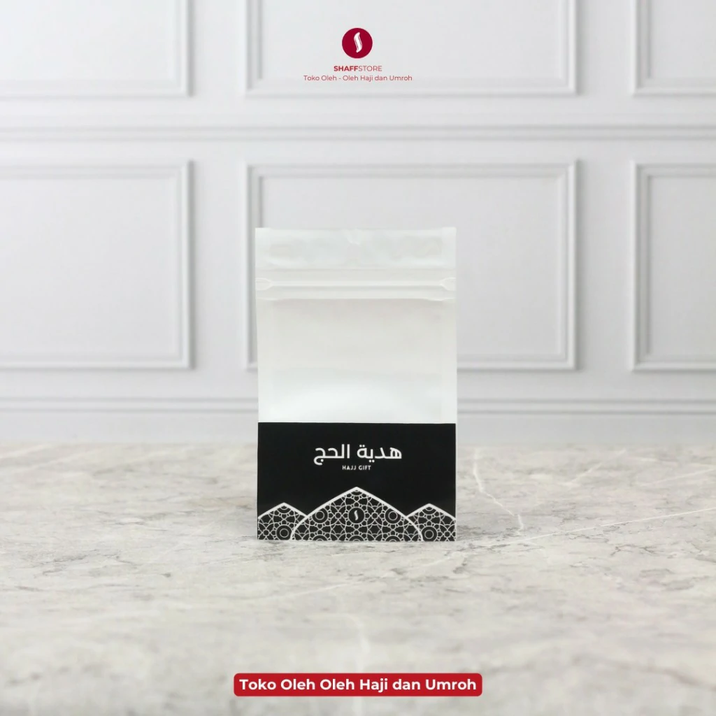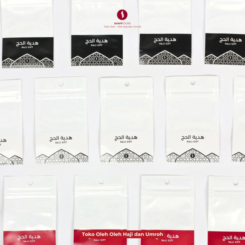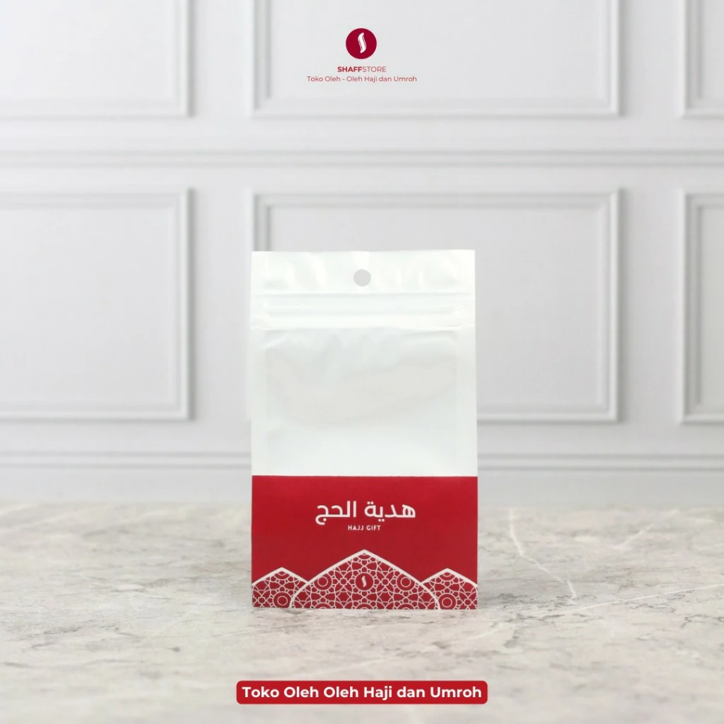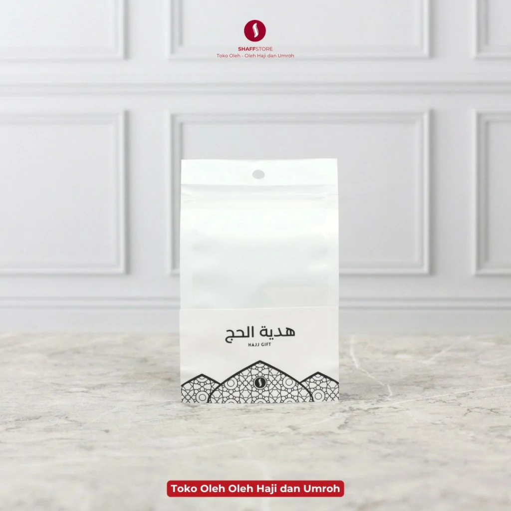 Kemasan plastik ziplock yang praktis dan aman untuk menyimpan berbagai jenis makanan kering atau souvenir haji. Tersedia dengan stiker tulisan “Hajj Gift” yang elegan dan bermakna.