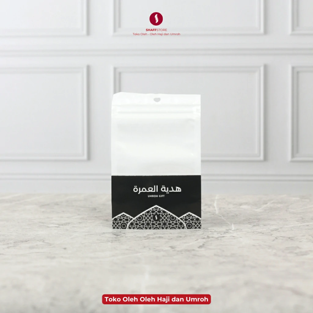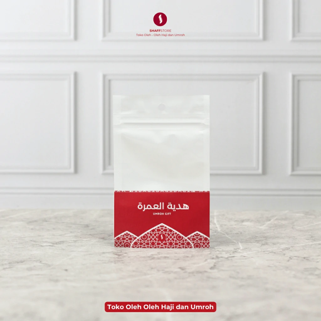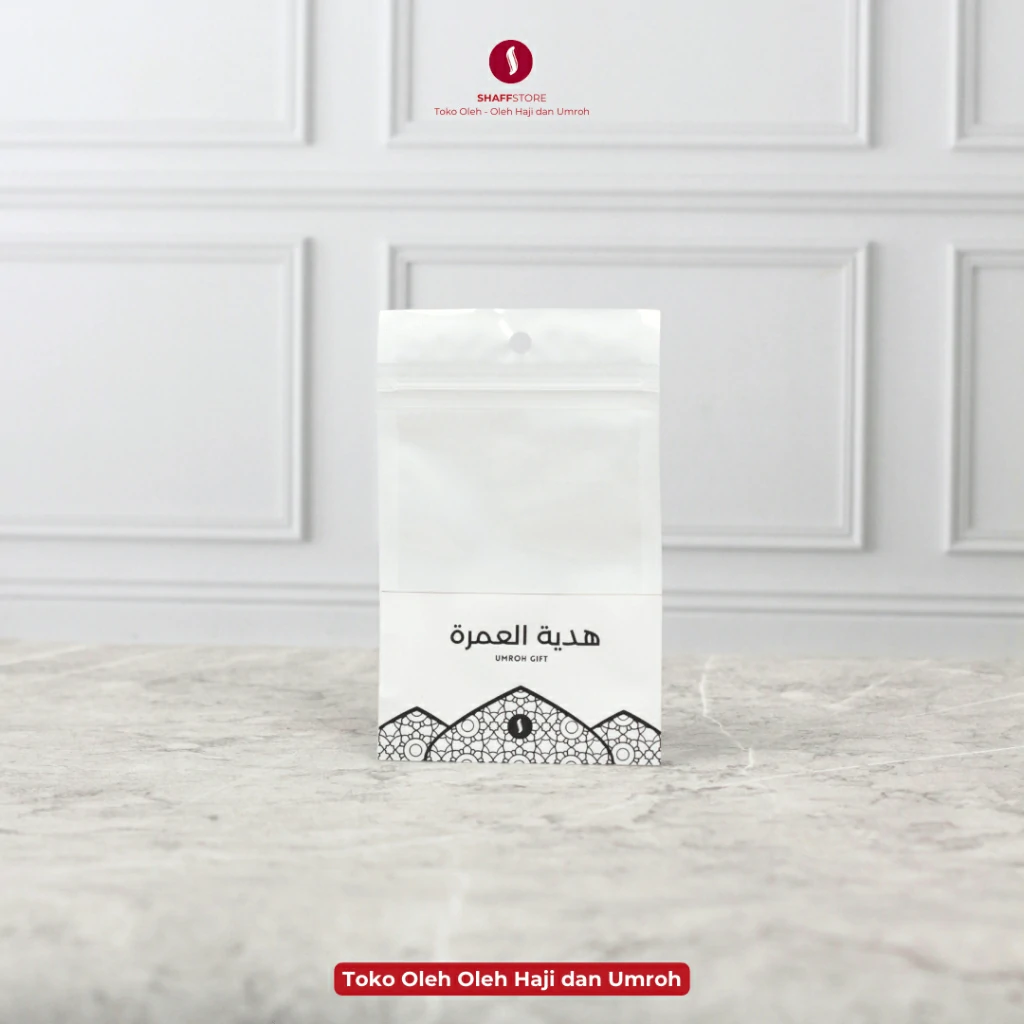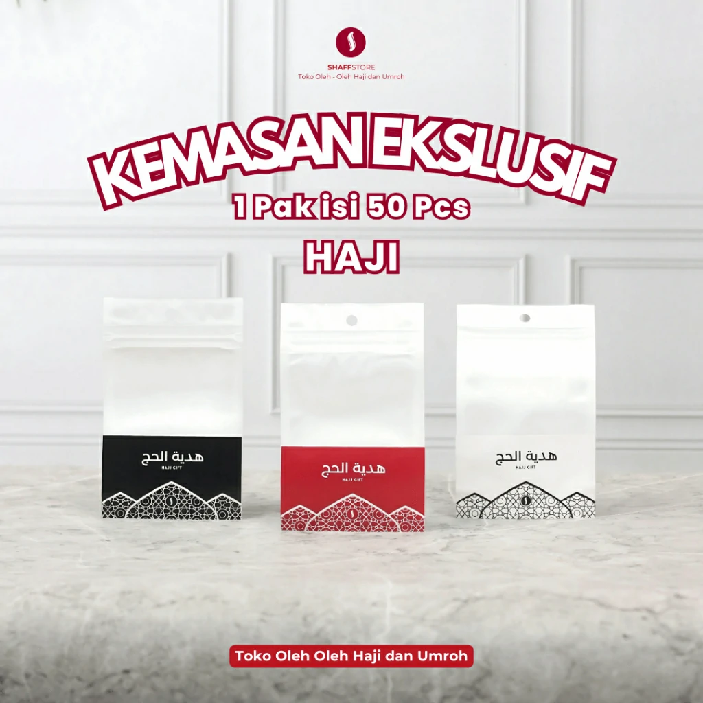 Kemasan plastik ziplock yang praktis dan aman untuk menyimpan berbagai jenis makanan kering atau souvenir haji. Tersedia dengan stiker tulisan “Hajj Gift” yang elegan dan bermakna.